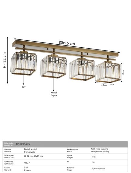 Produktnavn: AVONNI AV-60230-4EY Tumlet belagt moderne lysekrone E27 metalkrystal 80x15cm Varekode: AV-1795-4EY Familiekode: 1795 Kategori: Moderne lysekrone Højde: 22 cm