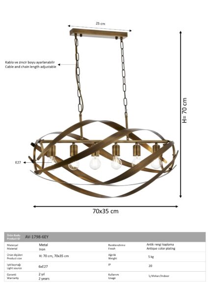 Produktnavn: AVONNI AV-60249-6EY Tumbled Finish Modern lysekrone E27 Metal 70x35cm Produktkode: AV-1798-6EY Familiekode: 1798 Kategori: Moderne lysekrone Højde: 70 cm
