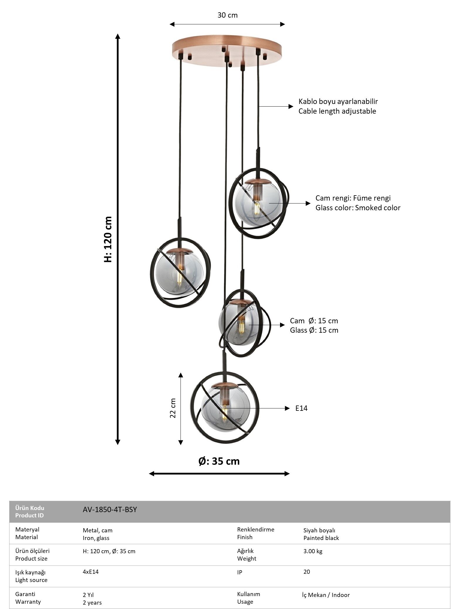 Pæretype: 4 x E14 Max.4W – Pærer medfølger ikke